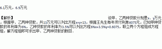 蔬菜种植专业户王先生要办一个小型蔬菜加工厂,分别向银行申请甲、乙两种贷款,共13万元,王先生每年须付利息6075元,已知甲种贷款的年利率为6%,乙种贷款的年利率为3.5%,则甲、乙两种贷款分别是______万元和______万元.