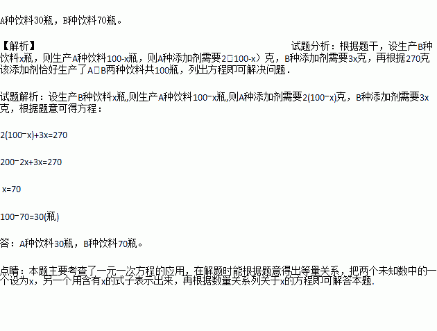 食品安全是老百姓关注的话题,在食品中添加过量的添加剂对人体有害,但适量的添加剂对人体无害且有利于食品的储存和运输.某饮料加工厂生产的A、B两种饮料均需加入同种添加剂,A饮料每瓶需加该添加剂2克,B饮料每瓶需加该添加剂3克,已知270克该添加剂恰好生产了A、B两种饮料共100瓶,问A、B两种饮料各生产了多少瓶?
