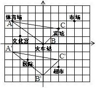 (3)请将体育场、宾馆和火车站看作三点用线段连起来,得△ABC,然后将此三角形向下平移4个单位长度,再画出平移后的△A'B'C';
