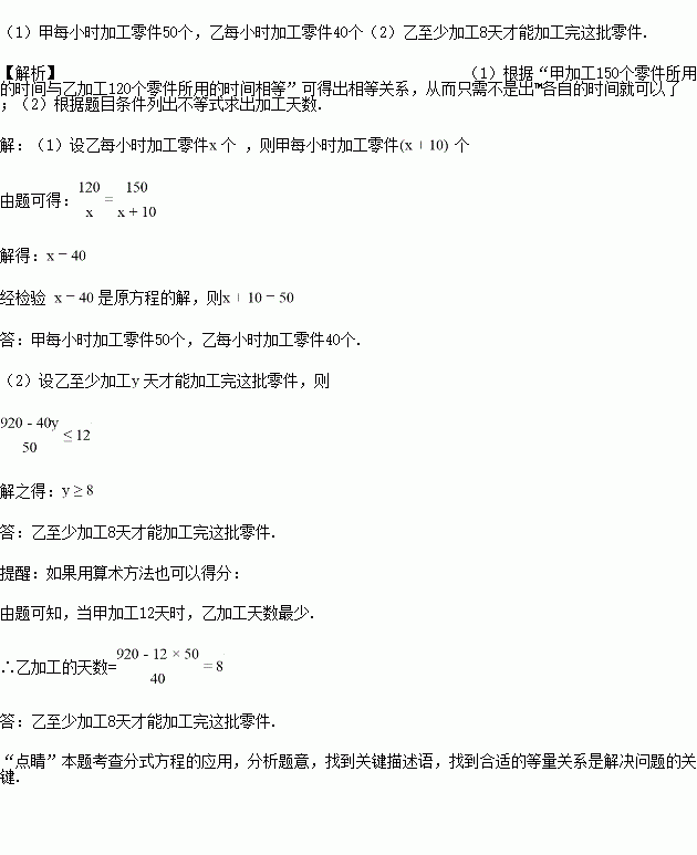 (2)该工厂计划加工920个零件,甲参与加工这批零件不超过12天,则乙至少加工多少天才能加工完这批零件?