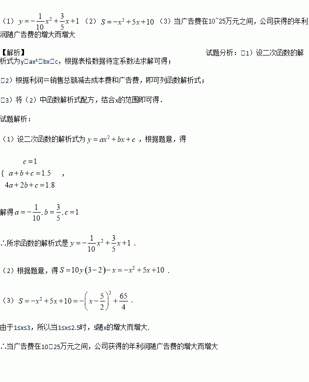 某公司生产的A种产品,它的成本是2元,售价是3元,年销售量为100万件,为了获得更好的效益,公司准备拿出一定的资金做广告. 根据经验,每年投入的广告费是x(10万元)时,产品的年销售量将是原销售量的y倍,且y是x的二次函数,它们的关系如下表: