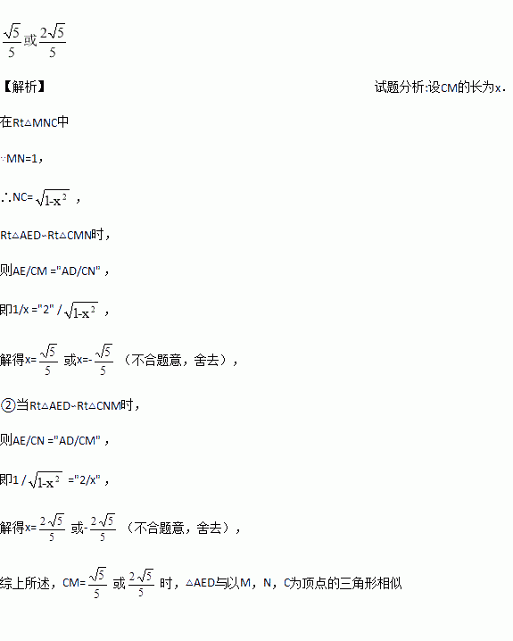 如图,正方形ABCD的边长为2,AE=EB,MN=1,线段MN的两端在CB,CD上滑动,当CM=__时,△AED与以M,N,C为顶点的三角形相似.