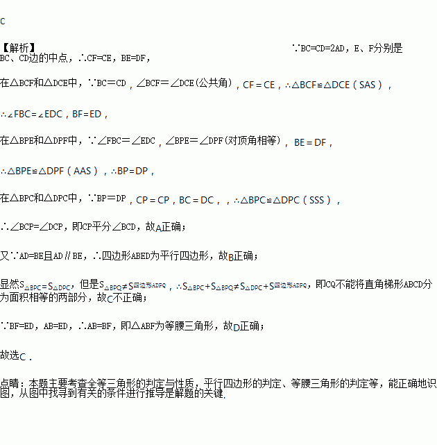 C. CQ将直角梯形分为面积相等的两部分 D. △ABF为等腰三角形