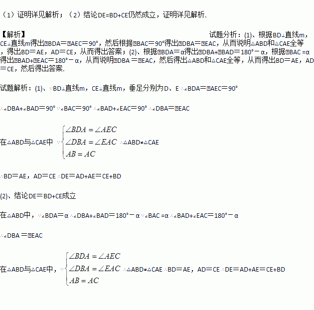 (2)如图②,将(1)中的条件改为:在△ABC中,AB=AC,D、A、E三点都在直线m上,并且有∠BDA=∠AEC=∠BAC=α,其中α为任意钝角.请问结论DE=BD+CE是否成立?如成立,请你给出证明;若不成立,请说明理由.