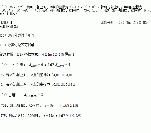(3)如图2,把线段AB向上平移2个单位得到线段EF,连接AE,BF,EF交y轴于点G,过点C作CD⊥AB于点D,将长方形GOBF以每秒0.5个单位长度的速度向左平移,同时,动点M从点A出发,以相同的速度沿折线AECDA运动,当长方形GOBF与长方形AECD重叠面积为1时,求此时点M的坐标.