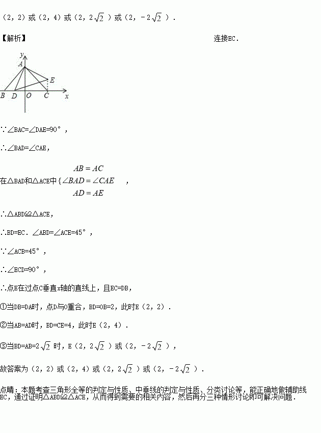 如图,在平面直角坐标系中,点A(0,2),B(﹣2,0),点D是x轴上一个动点,以AD为一直角边在一侧作等腰直角三角形ADE,∠DAE=90°,若△ABD为等腰三角形时点E的坐标为___________.