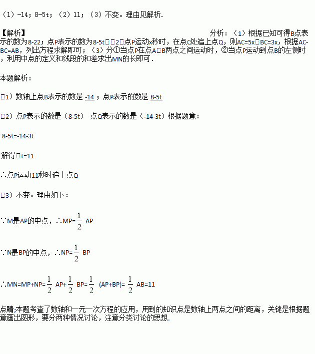 如图,已知数轴上点A表示的数为8,B是数轴上位于点A左侧一点,且AB=22,动点P从A点出发,以每秒5个单位长度的速度沿数轴向左匀速运动,设运动时间为t(t>0)秒.
