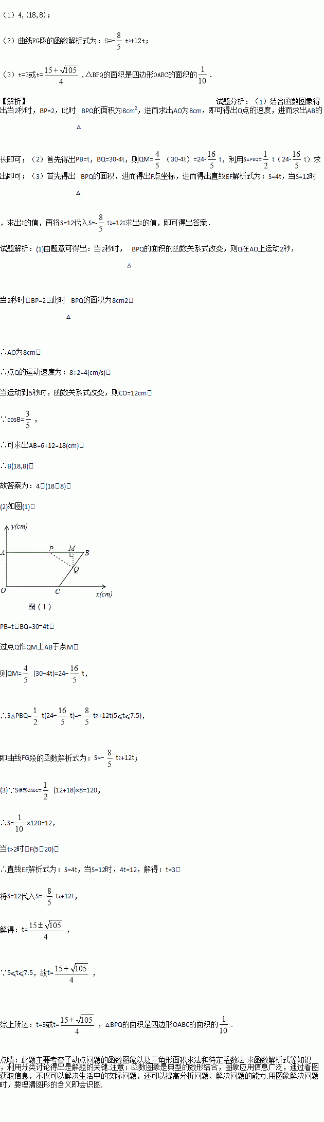 .点P从B点出发,以1cm/s的速度沿边BA匀速运动,点Q从点A出发,沿线段AO-OC-CB匀速运动.点P与点Q同时出发,其中一点到达终点,另一点也随之停止运动.设点P运动的时间为t(s),△BPQ的面积为S(cm2), 已知S与t之间的函数关系如图(2)中的曲线段OE、线段EF与曲线段FG.