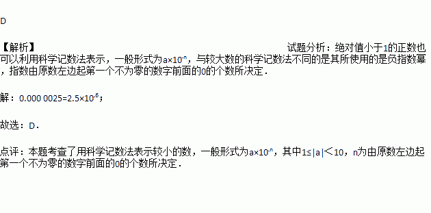 PM2.5是大气压中直径小于或等于0.0000025m的颗粒物,将0.0000025用科学记数法表示为( )