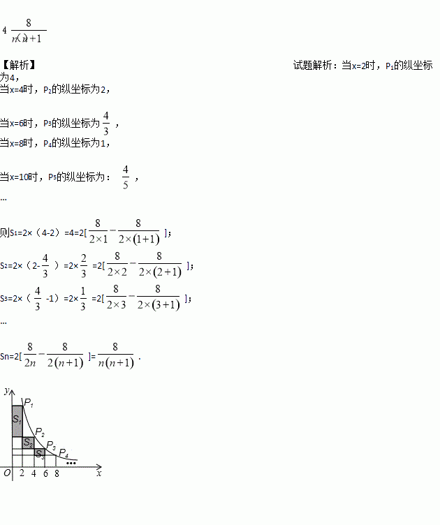 (x>0)的图象上有点P1、P2、P3…、Pn、Pn+1,点P1的横坐标为2,且后面每个点的横坐标与它前面相邻点的横坐标的差都是2,过点P1、P2、P3…、Pn、Pn+1分别作x轴、y轴的垂线段,构成若干个矩形,如图所示,将图中阴影部分的面积从左至右依次记为S1、S2、S3…、Sn,则S1=__,Sn=__.(用含n的代数式表示)