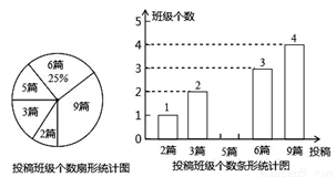 我市某校在八,九年级开展征文活动,校学生会对这两个年级各班内的投稿情况进行统计,并制成了如图所示的两幅不完整的统计图.