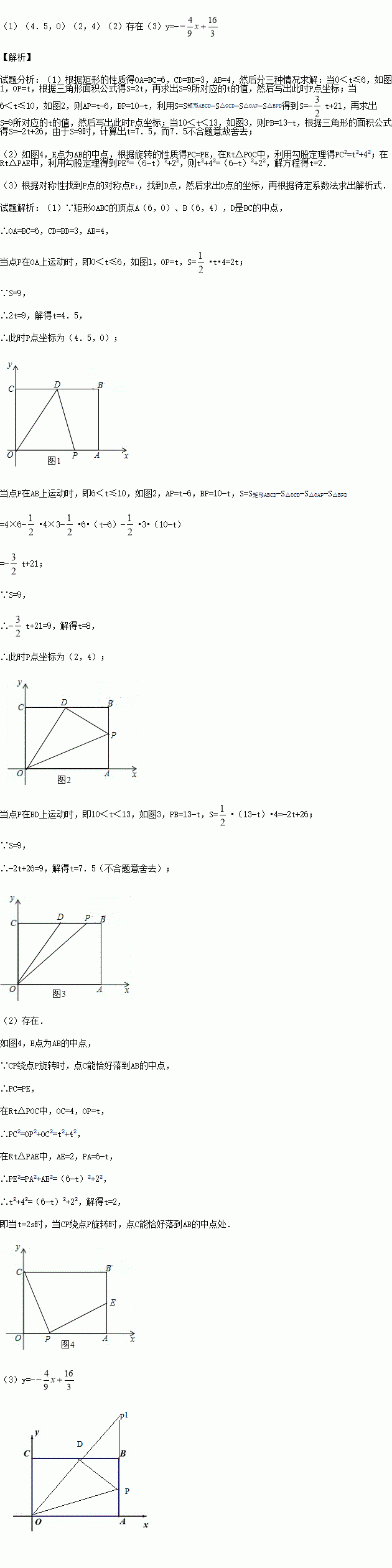已知:如图,平面直角坐标系中,矩形OABC的顶点A(6,0)、B(6,4),D是BC的中点.动点P从O点出发,以每秒1个单位的速度,沿着OA、AB、BD运动.设P点运动的时间为t秒(0<t<13).
