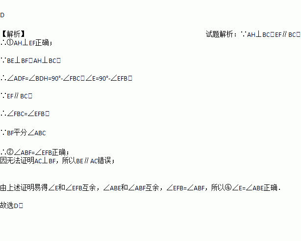 如图,△ABC中,AH⊥BC,BF平分∠ABC,BE⊥BF,EF∥BC,以下四个结论①AH⊥EF,②∠ABF=∠EFB,③AC∥BE,④∠E=∠ABE.正确的是( )