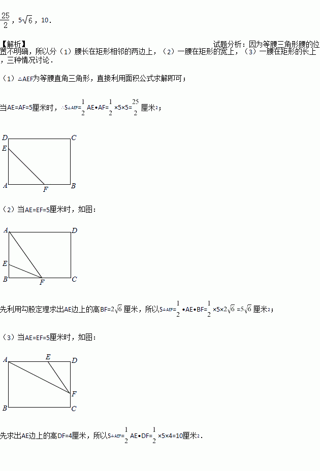 如图,在一张长为8cm,宽为6cm的矩形纸片上,现要剪下一个腰长为5cm的等腰三角形(要求:等腰三角形的一个顶点与矩形的一个顶点重合,其余的两个顶点在矩形的边上).则剪下的等腰三角形的面积为__________.