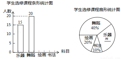 为发展学生的核心素养,培养学生的综合能力,某学校计划开设四门选修课:乐器、舞蹈、绘画、书法,学校采取随机抽样的方法进行问卷调查(每个被调查的学生必须选择而且只能选择其中一门).对调查结果进行整理,绘制成如下两幅不完整的统计图,请结合图中所给信息解答下列问题: