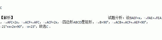 在探索“尺规三等分角”这个数学名题的过程中,曾利用了下图,该图中,四边形ABCD是矩形,E是BA延长线上一点,F是CE上一点,∠ACF=∠AFC,∠FAE=∠FEA.若∠ACB=21°,则∠ECD的度数是( )