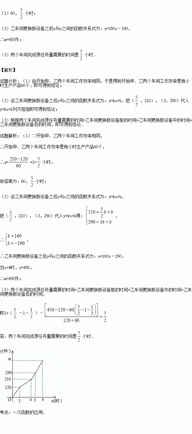 某工厂甲、乙两个车间同时开始生产某种产品,产品总任务量为m件,开始甲、乙两个车间工作效率相同.乙车间在生产一段时间后,停止生产,更换新设备,之后工作效率提高.甲车间始终按原工作效率生产.甲、乙两车间生产的产品总件数y与甲的生产时间x(时)的函数图象如图所示.