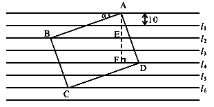 如图:把一张给定大小的长方形卡片ABCD放在宽度为10mm的横格纸中,恰好四个顶点都在横格线上,已知α=32°,求长方形卡片的周长。![]()