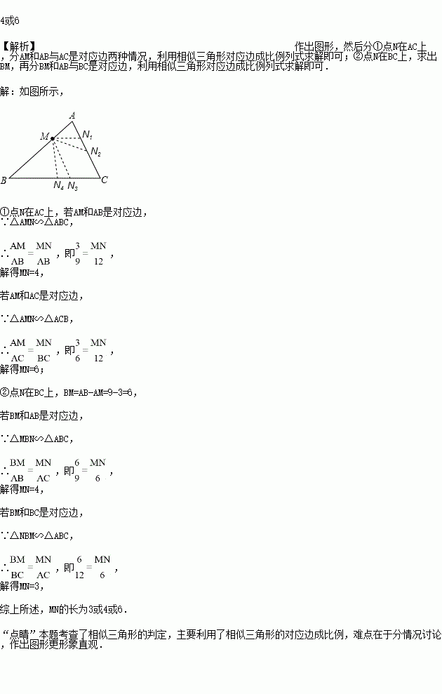 如图,在△ABC中,AB=9,AC=6,BC=12,点M在AB边上,且AM=3,过点M作直线MN与AC边交于点N,使截得的三角形与原三角形相似,则MN=____________.