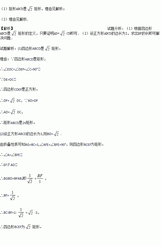 (1)如图1所示,将一张矩形纸片ABCD进行如下操作:将点C沿着过点D的直线折叠,使折叠后的点C落在边AD上的点E处,折痕为DF,通过测量发现DF=AD,则矩形ABCD是