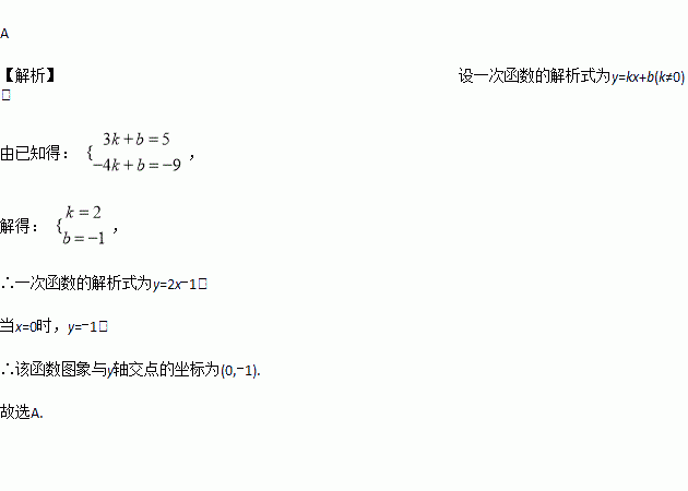 已知一次函数的图象过点(3,5)与(-4,-9),则该函数的图象与y轴交点的坐标为( )