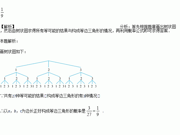 三张背面完全相同的数字牌,它们的正面分别印有数字1,2,3,将它们背面朝上,洗匀后随机抽取一张,记录牌上的数字并把牌放回,再重复这样的步骤两次,得到三个数字a,b,c,求以a,b,c为边长正好构成等边三角形的概率.