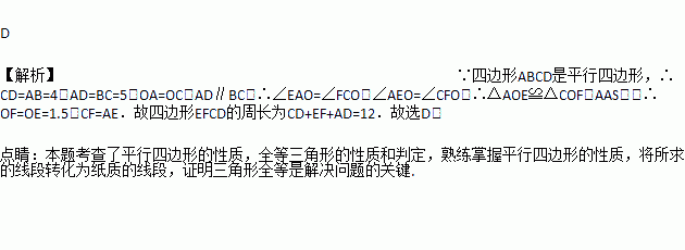如图,平行四边形ABCD的对角线AC、BD相交于O,EF过点O与AD、BC分别相交于E、F.若AB=4,BC=5,OE=1.5,那么四边形EFCD的周长为( )