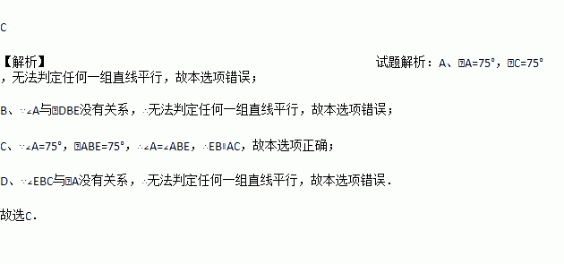 A. ∠C=75° B. ∠DBE=75° C. ∠ABE=75° D. ∠EBC=105°