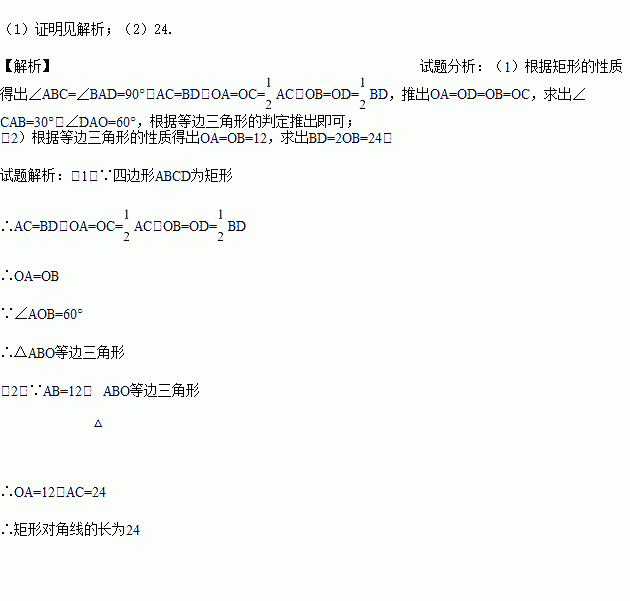 已知:如图,矩形ABCD的两条对角线AC,BD所夹的锐角为60度,较短的边长AB=12cm求证:(1)△ABO等边三角形; (2)求矩形对角线的长。