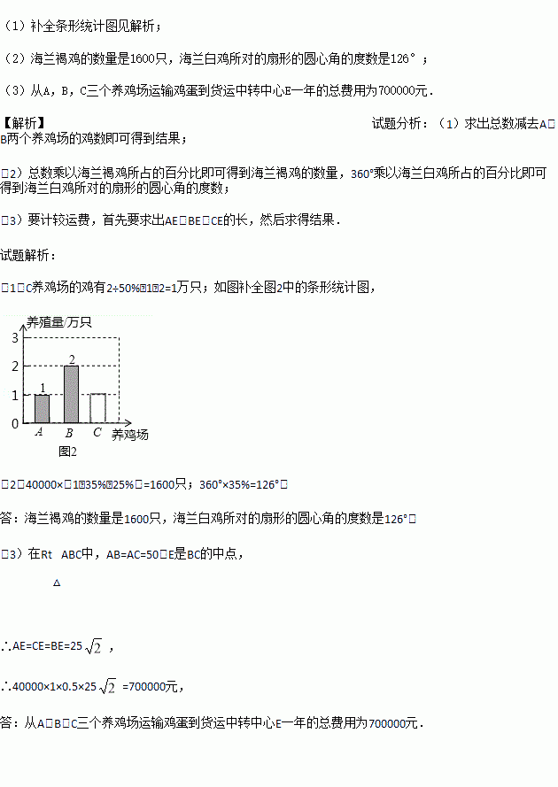 ÎÒÏØ´óÁ¦·ö³ÖºÍ·¢Õ¹Ñø¼¦ÊÂÒµ£¬A£¬B£¬CÈý¼ÒÑø¼¦³¡Ö®¼äµÄλÖùØÏµÈçͼ1Ëùʾ£¬ÒÑÖªBÑø¼¦³¡ÔÚAÑø¼¦³¡µÄÕý¶«·½Ïò50¹«Àï´¦£¬CÑø¼¦³¡ÔÚAÑø¼¦³¡µÄÕý±±·½Ïò50¹«Àï´¦£¬AÑø¼¦³¡ÓÐ1ÍòÖ»¼¦£¬BÑø¼¦³¡µÄÑøÖ³Á¿ÊÇÕâÈý½ÇÑøÖ³³¡µÄ×ÜÑøÖ³Á¿µÄ50%£¬CÑø¼¦³¡ÑøÁËÈýÖÖ¼¦£¬Íõ·¼Í¬Ñ§½«¸÷Ñø¼¦³¡µÄÑøÖ³Á¿»æÖƳÉÈçͼ2ËùʾµÄ²»ÍêÕûµÄÌõÐÎͳ¼ÆÍ¼£¬½«CÑø¼¦³¡¸÷ÖÖ¼¦µÄÑøÖ³Á¿»æÖƳÉÈçͼ3ËùʾµÄÉÈÐÎͳ¼ÆÍ¼£®