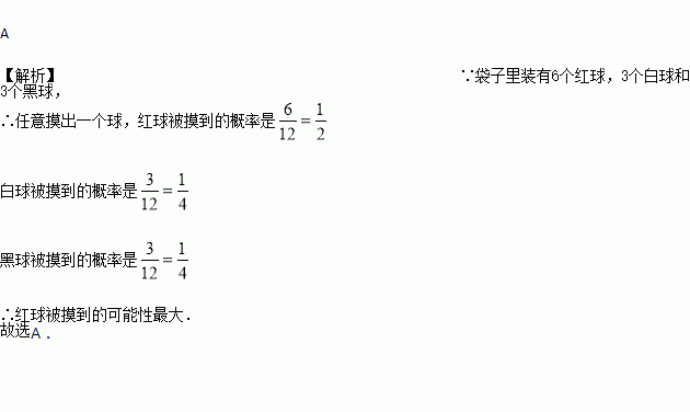 一个袋子里装有6个红球、3个白球和3个黑球,每个球除颜色外都相同,任意摸出一个球,被摸到的可能性最大的球是( )