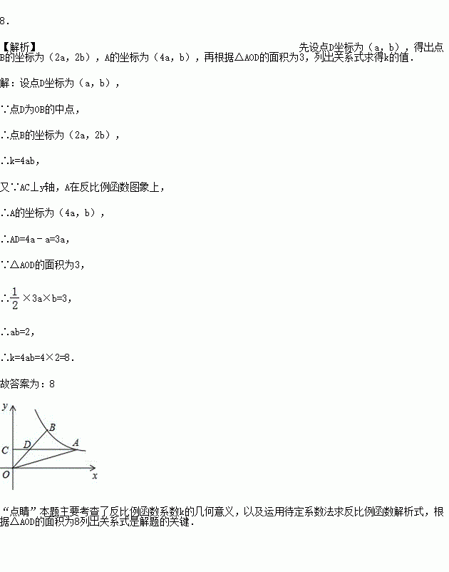 图象上的两点,过点A作AC⊥y轴,垂足为C,AC交OB于点D.若D为OB的中点,△AOD的面积为3,则k的值为_____.