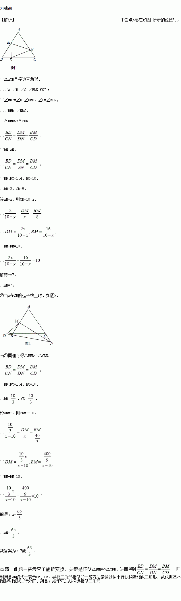 如图,等边△ABC的边长为30,点M为线段AB上一动点,将等边△ABC沿过点M的直线折叠,使点A落在直线BC上的点D处,且BD∶DC=1∶4,折痕与直线AC交于点N,则AN的长为________.