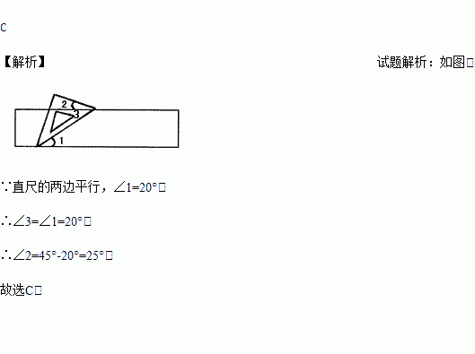 如图,把一块含有45°的直角三角形的两个顶点放在直尺的对边上.如果∠1=20°,那么∠2的度数是( )