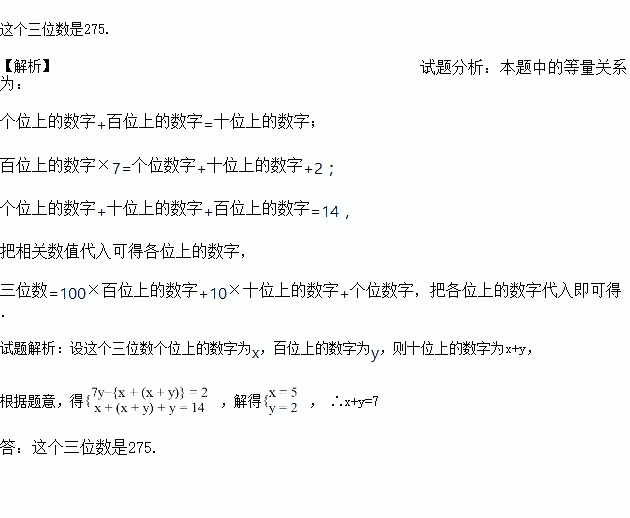 一个三位数,个位,百位上的数字的和等于十位上的数字,百位上的数字的7倍比个位,十位上的数字的和大2,个位,十位,百位上的数字的和是14,求这个三位数.