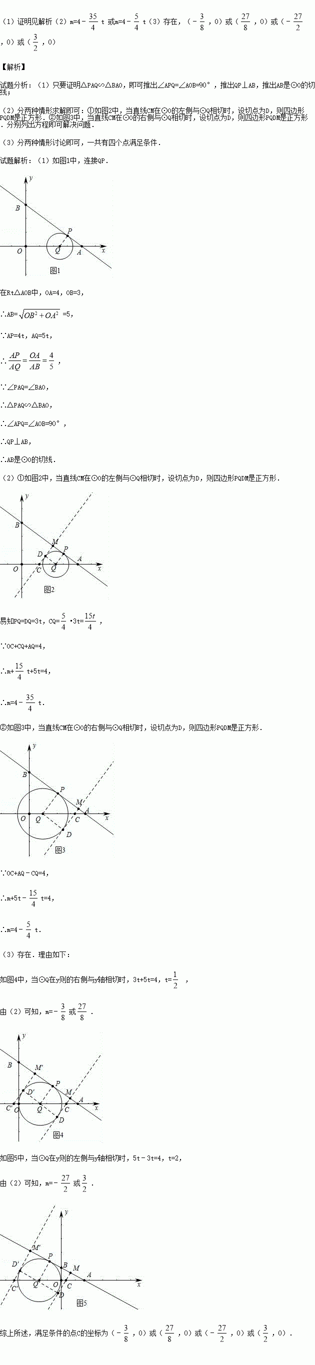 (2)过点A左侧x轴上的任意一点C(m,0),作直线AB的垂线CM,垂足为M,若CM与⊙Q相切于点D,求m与t的函数关系式(不需写出自变量的取值范围);