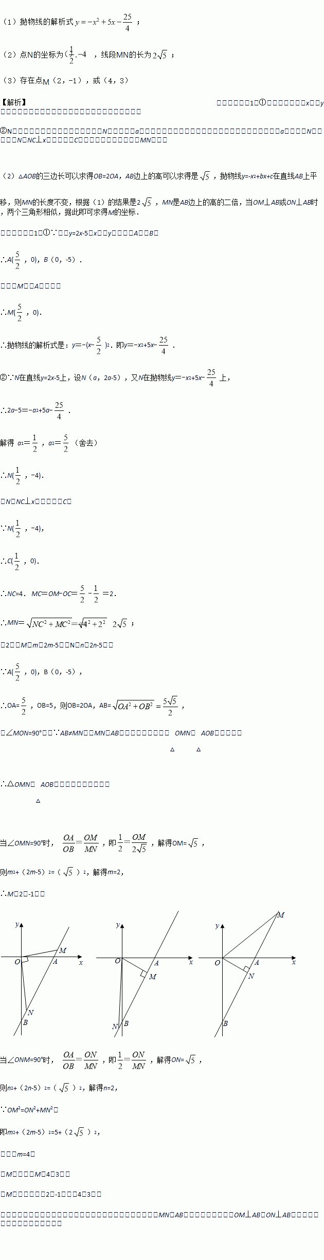 已知直线y=2x-5与x轴和y轴分别交于点A和点B,抛物线y=-x2+bx+c的顶点M在直线AB上,且抛物线与直线AB的另一个交点为N.