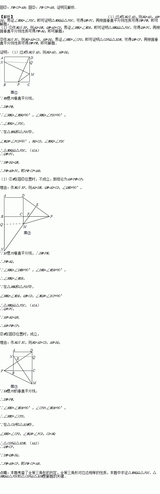 (1)当点M在CD边上时如图①,易证PM-CP=AN;