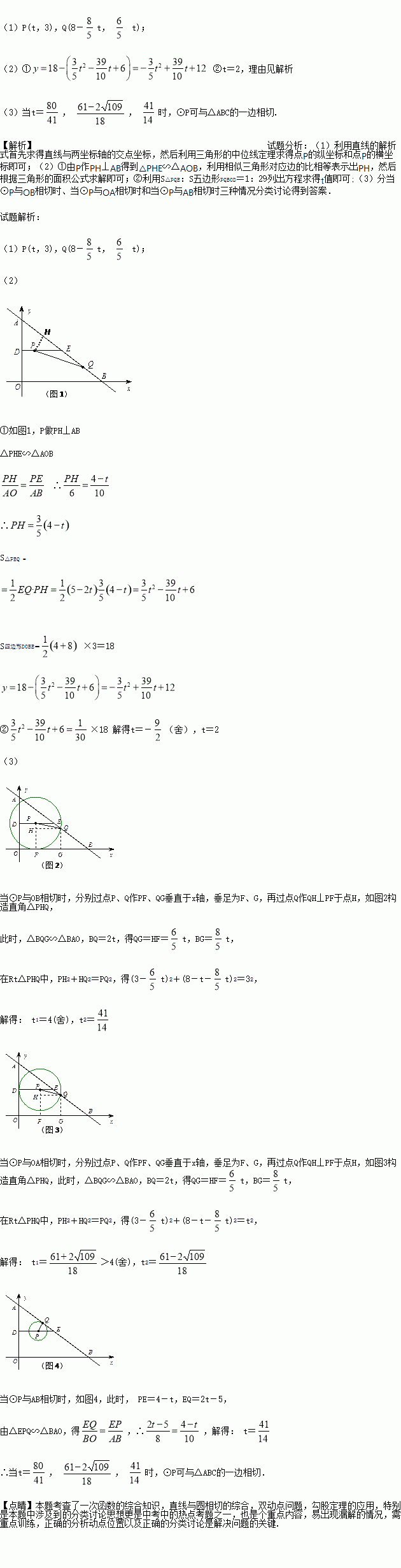 (3)以P为圆心、PQ长为半径作圆,请问:在整个运动过程中,当t为何值时,⊙P能与△ABO的一边相切?