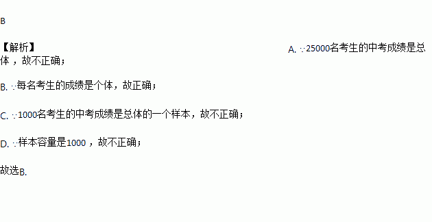某市2017年有25000名学生参加中考,为了了解这25000名考生的中考成绩,从中抽取了1000名考生的成绩进行分析,以下说法正确的是( )2