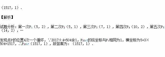 如图,把正方形铁片OABC置于平面直角坐标系中,顶点A的坐标为(3,0),点P(1,2)在正方形铁片上,将正方形铁片绕其右下角的顶点按顺时针方向依次旋转90°,第一次旋转至图①位置,第二次旋转至图②位置…,则正方形铁片连续旋转2017次后,点P的坐标为 .