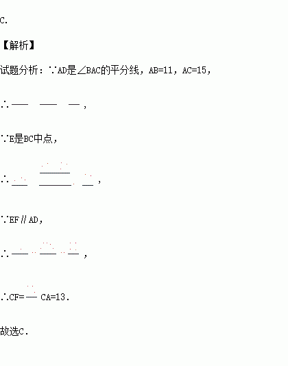 如图,△ABC中,E是BC中点,AD是∠BAC的平分线,EF∥AD交AC于F.若AB=11,AC=15,则FC的长为( )