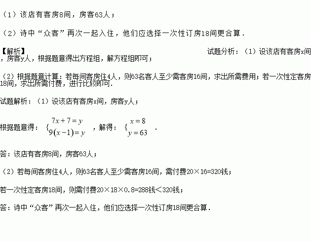 (2)假设店主李三公将客房进行改造后,房间数大大增加.每间客房收费20钱,且每间客房最多入住4人,一次性定客房18间以上(含18间),房费按8折优惠.若诗中“众客”再次一起入住,他们如何订房更合算?