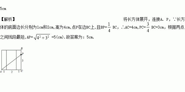 如图,长方体的底面边长分别为1cm 和2cm,高为4cm,点P在边BC上,BP=