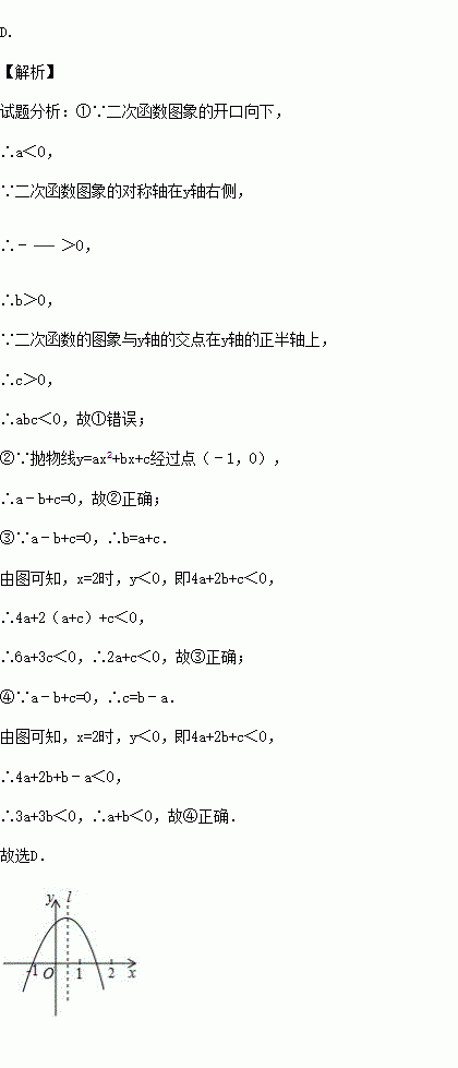如图,抛物线y=ax2+bx+c经过点(﹣1,0),对称轴l如图所示,则下列结论:①abc>0;②a﹣b+c=0;③2a+c<0;④a+b<0,其中所有正确的结论是( )