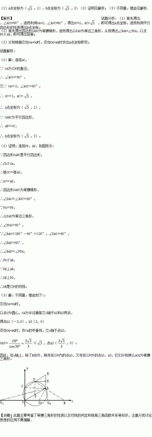 (3) 小明在解答本题时,发现连结DA并延长,交x轴于点N,则△AON是等腰三角形.由此,他断定:“x轴上一定存在除点N以外的点Q,使△AOQ也是等腰三角形,且点Q一定在⊙P外”.你同意他的看法吗?请充分说明理由.