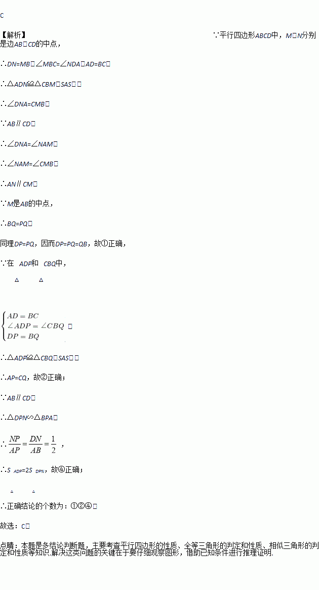 如图,在□ABCD中,MN分别是AB、CD的中点,BD分别交AN、CM于点P、Q,在结论: ①DP=PQ=QB ②AP=CQ ③PD=PN ④S△ADP=2S△DPN中,正确的为 ( )
