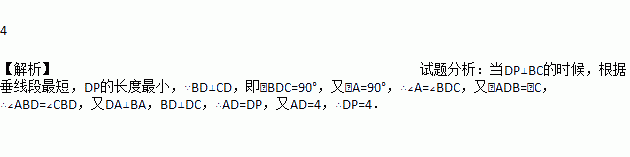如图,在四边形ABCD中,∠A=90°,AD=4,连接BD,BD⊥CD,∠ADB=∠C.若P是BC边上一动点,则DP长的最小值为________。