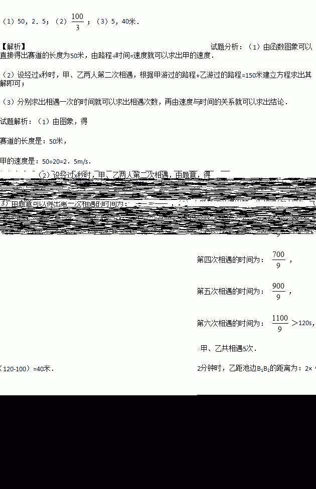 (3)若从甲、乙两人同时开始出发到2分钟为止,甲、乙共相遇了 次.2分钟时,乙距池边B1B2的距离为多少米。