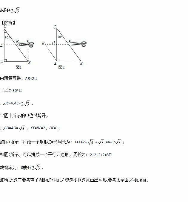 如图,有一张一个角为30°,最小边长为2的直角三角形纸片,沿图中所示的中位线剪开后,将两部分拼成一个四边形,所得四边形的周长是 ________.